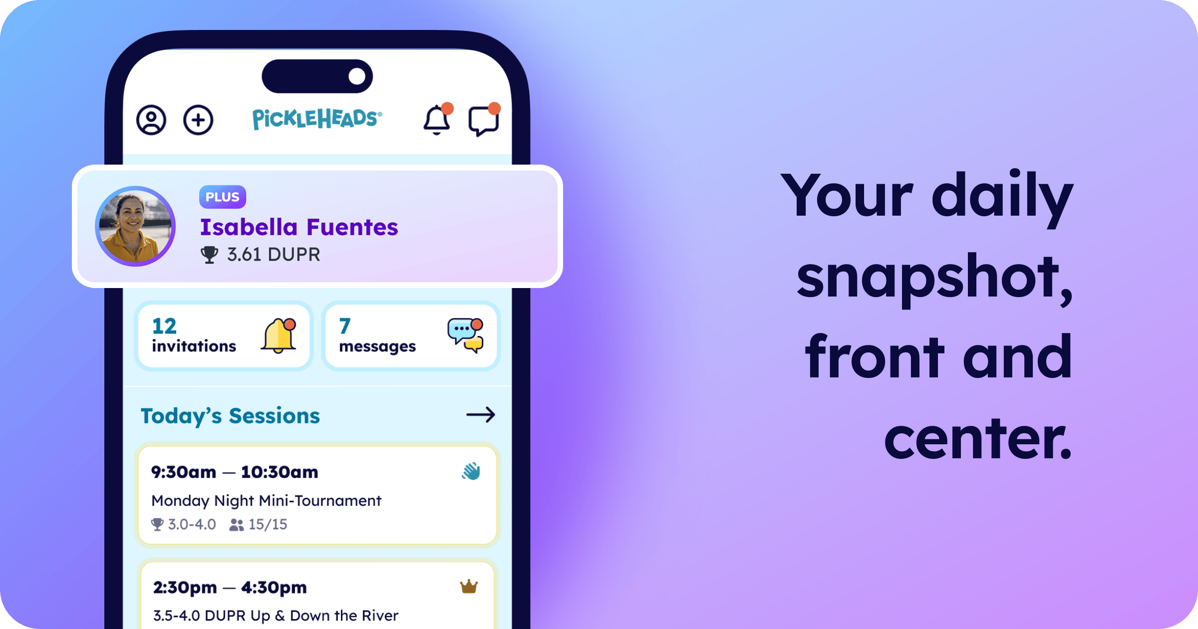 Invites and messages are now a tap away: Your player card sits at the top with pending invites and unread messages right underneath. See an invite, tap it, you're in. No digging through tabs to find it.